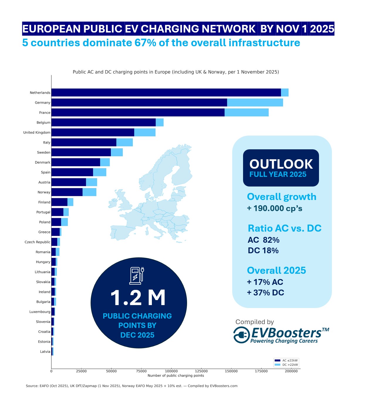This analysis uses EAFO public charging data (2020 – Oct 2025), UK data from Zapmap, Norway datasets and EVBoosters’ validated projections for 2025. Growth calculations incorporate insights from EAFO, ICCT, BloombergNEF, McKinsey, ACEA, EIT Urban Mobility and European Commission AFIR documentation.