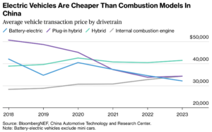 China has reached a significant milestone in the electric vehicle (EV) market: EVs are now cheaper than their internal combustion engine (ICE) counterparts. This shift