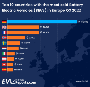 Check out this overview covering the top 10 countries in Europe with the most sold Battery Electric Vehicles (BEVs) in Q3 of 2022. Germany, Europe’s