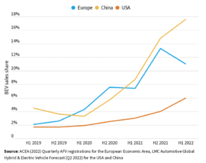 In the first half of 2022, electric vehicles accounted for 11.1% in sales of the European market. This is lower than the second half of
