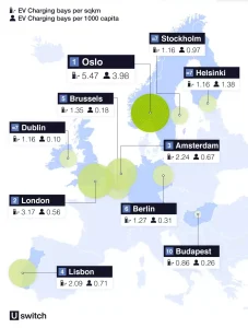 Uswitch conducted a study on 31 European capital cities to determine which cities had the highest density of public EV charge points.